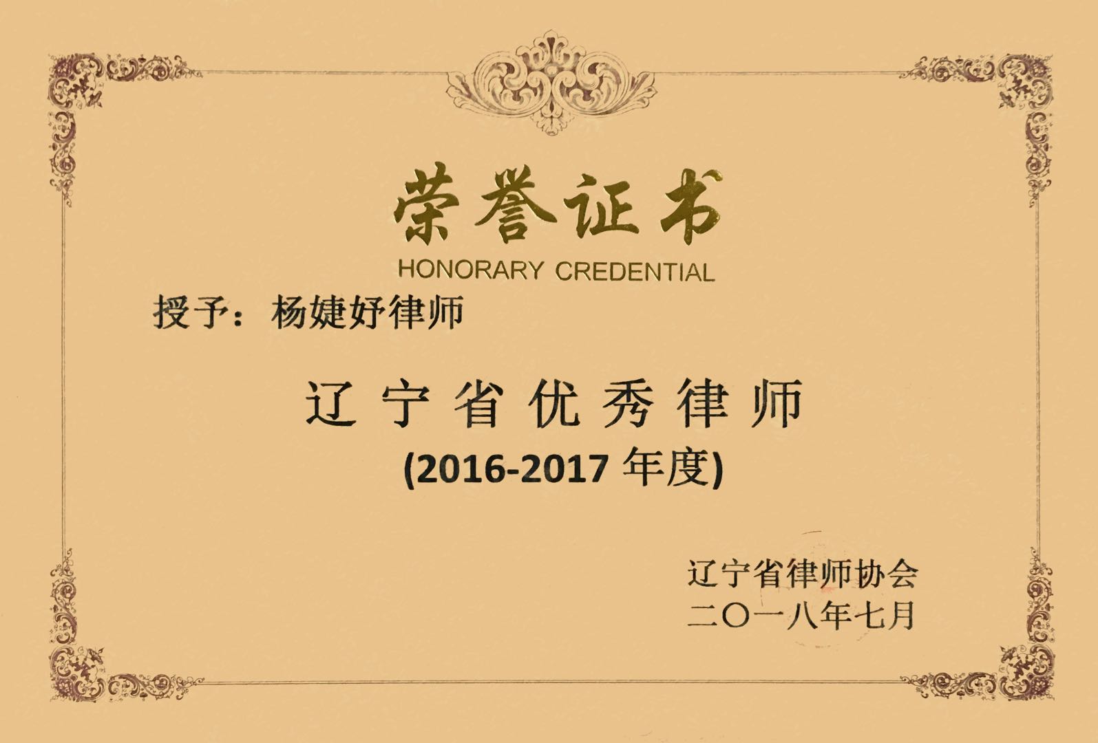 2016-2017年度辽宁省优秀律师-杨婕妤
